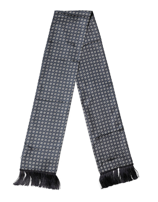 Blue Patterned Silk Fringes Foulard 138cm x 15.5cm Scarf